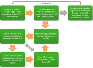 The script sends and receives commands to and from Google Apps Script, Google Sheets, and Google Forms services. For each infected user a unique Google Sheets spreadsheet is dynamically created in order to manage each victim. The use of a legitimate third party service like this one gives the attacker the ability to hide in plain sight.